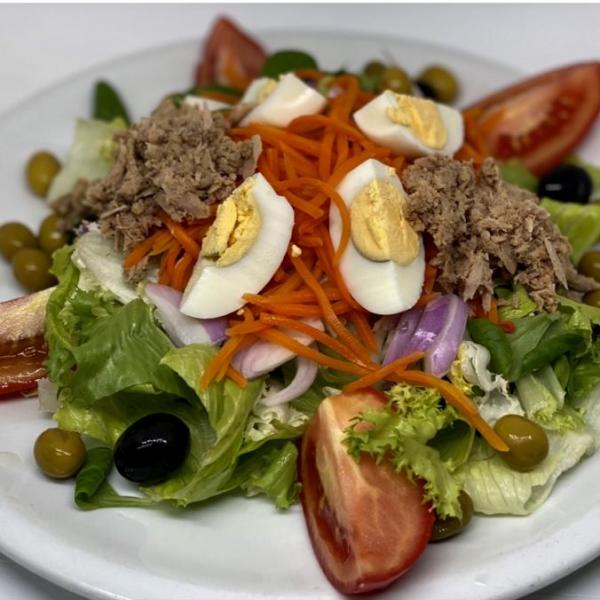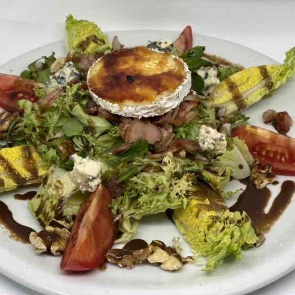 Ensalada de cogollos, queso de cabra, roquefort, bacon y frutos secos