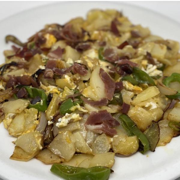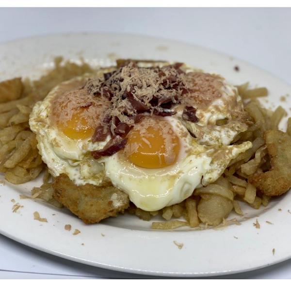 Patatas Panaderas con huevo frito, alcachofa rebozada y virutas de foie y jamón